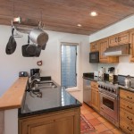 The renovated kitchen features dark granite countertops, pine cabinets, stainless steel appliances, a Viking stove and a hanging pot rack. The adjacent dining table seats six. A brick red console bridges the living area. A brick fireplace faces a matching couch and armchair. A watercolor painting decorates the wall. Bookshelves stock books, board games and puzzles. A natural jute area rug accents the room. A back deck boasts mountain views and teak table. Carpeted stairs lead to the master bedroom with its king bed, dark wood headboard, tawny bedding, two closets and chest of drawers. Floral drapes and a TV/DVD/VHS player round out the room’s amenities. A detached bath features a granite counter and tiled shower/tub. The second bedroom offers a pair of twin beds backed by wrought-iron bedframes and a large closet. Windows overlook the mountain panorama.