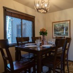 The foyer welcomes with its wood flooring and gear storage (hooks and a closet).The great room lures people inside with its deep leather couch and matching armchairs. Glass doors lead to a private deck with a gas grill and chairs. A TV nook also features a DVD player. Serene artwork lines the walls, and botanical elements accent the space. Pine trees peak through the windows. In the dining area, a tall table seats four beneath an antler chandelier. Nearby, a breakfast bar seats two. The renovated kitchen features granite tile countertops, modern appliances, a double stainless-steel sink and custom cabinetry.