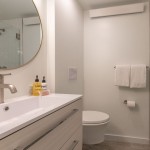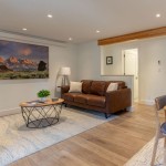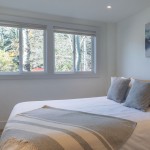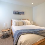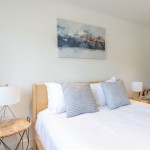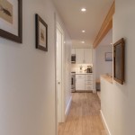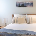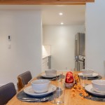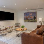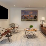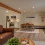 Open entering the condo, a wall-length bench is perfect for all your gear. The bench extends to an ample table, a great spot for a meal or board game. The blonde plank flooring that runs throughout the condominium together with the clean white walls allows the light to dance throughout the property. Just beyond the table, the kitchen has everything you need for a night of cooking in. The open floor plans means the cozy leather couch and fun armchairs are just steps away in the ample living space, featuring a large wall mounted smart TV.